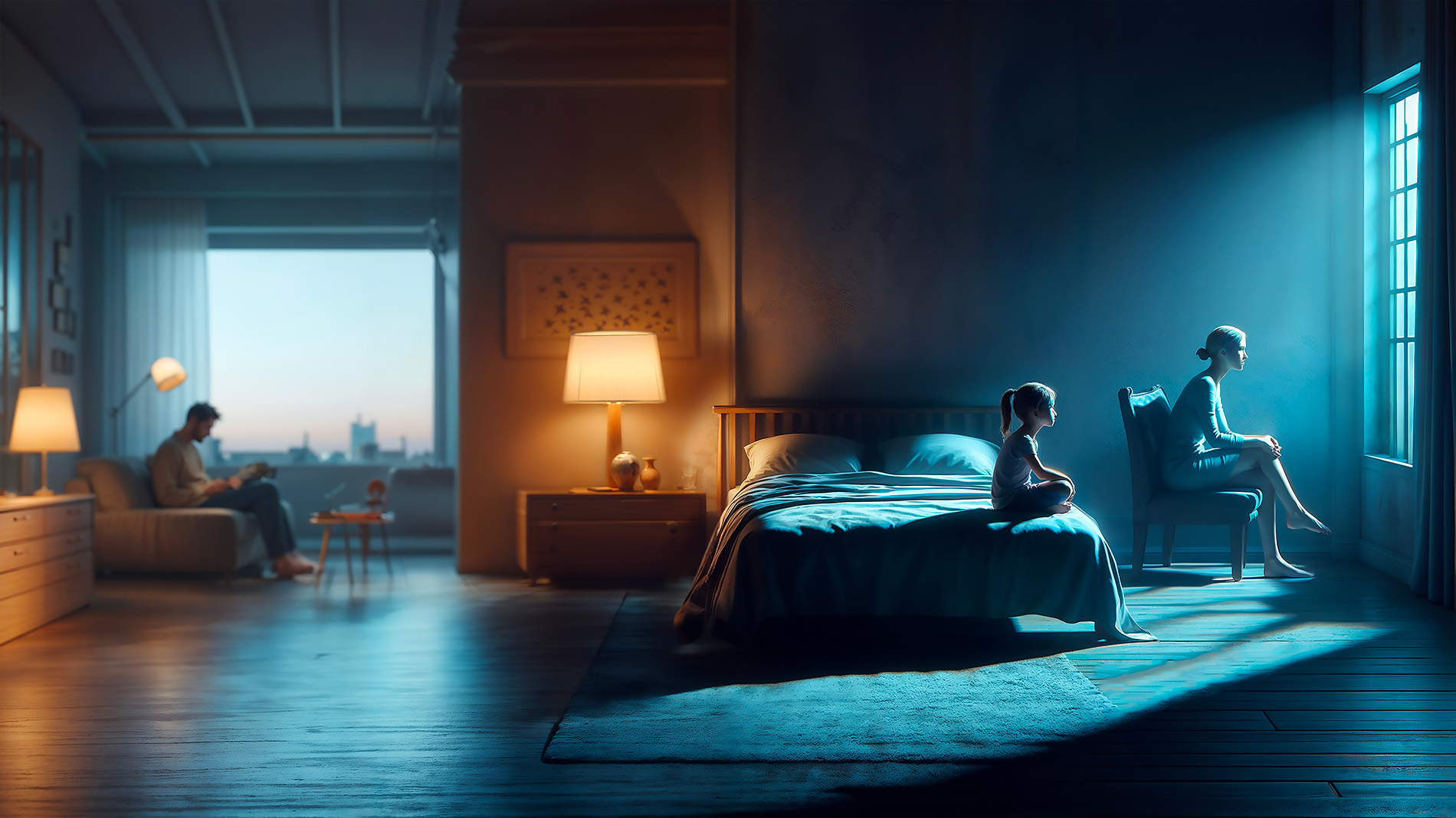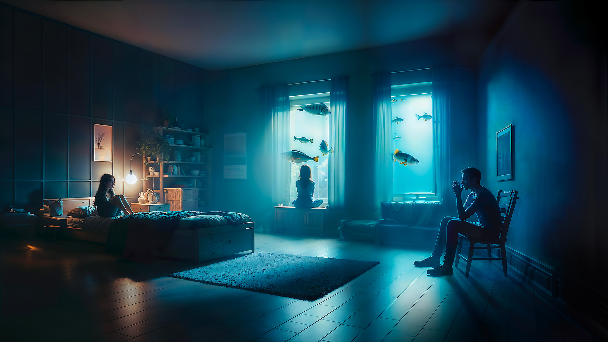 The man is alone, surrounded by his loved ones, but lost within the walls of his home, silent and powerless in the face of events. The style of the photos, with cold, nocturnal light, together with the composition, emphasizes the artificiality of the representations. The surreal and dreamlike atmospheres invite the viewer to look beyond the simple reproduction of reality, encouraging them to reflect on their own world and desire for communication.
